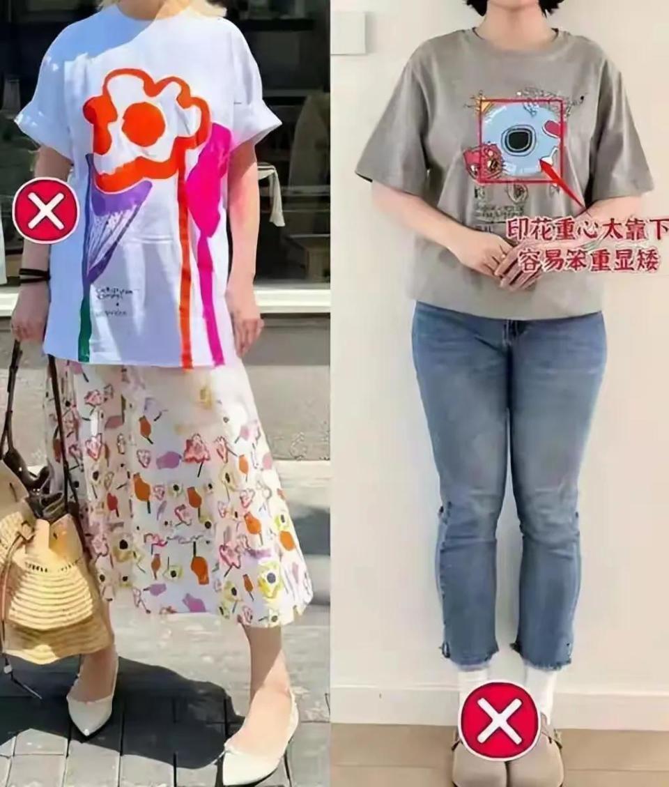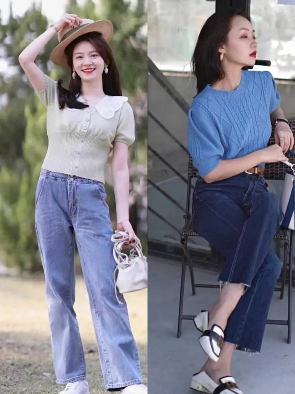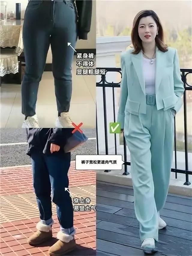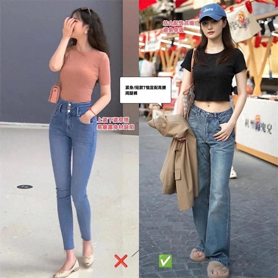 当然了,也不是说穿的越宽松越好,例如左下角的这条牛仔裤,虽然不是紧身款,但穿在身上之后,宽宽松松的,长度也不合适,还要把裤脚挽起来,看起来就显得土里土气的。