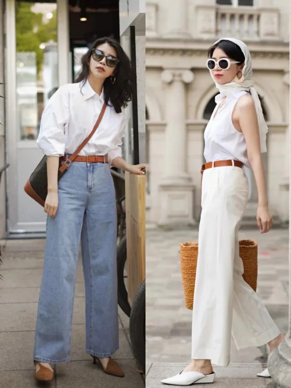 所以说选择裤子合身才是最好的,咱们穿衣打扮也不要盲目的跟风,例如下面用牛仔直筒裤或者是白色的西装裤,搭配上白色的上衣,穿的时候把上衣的衣角塞进裤子里面,再系上棕色的小腰带,这样就能很好的提升腰线