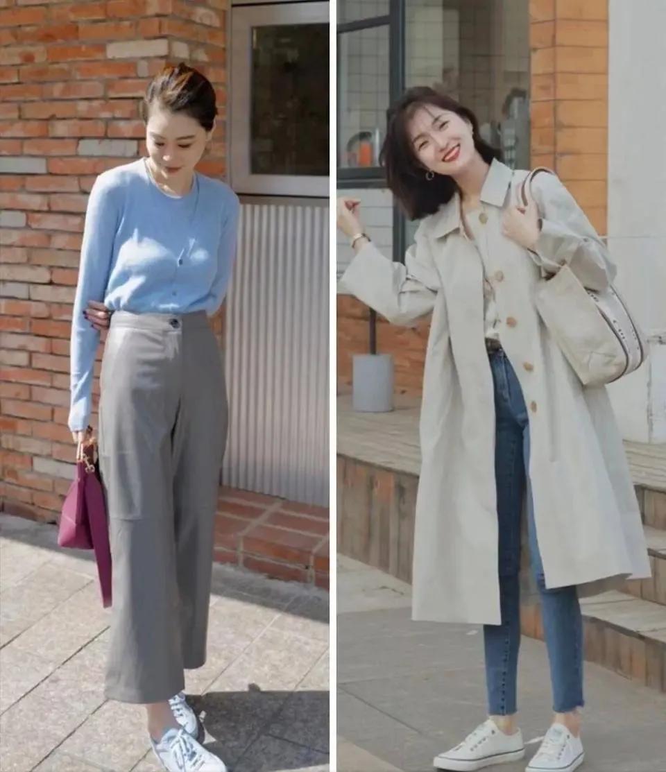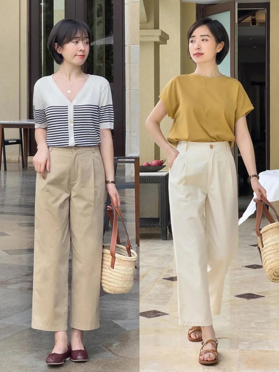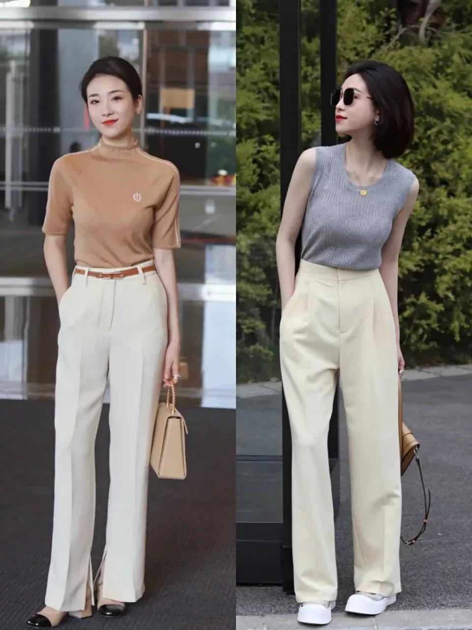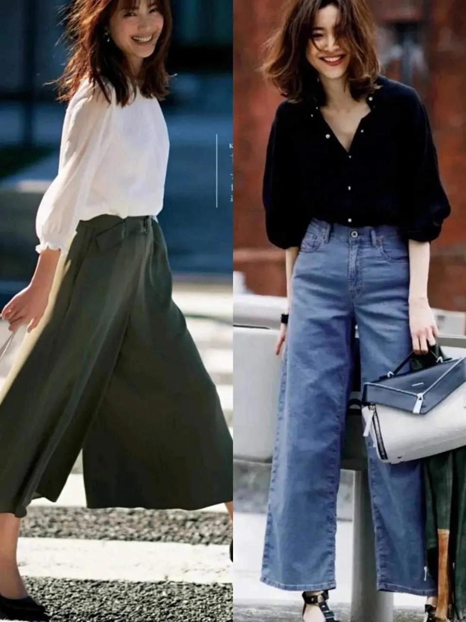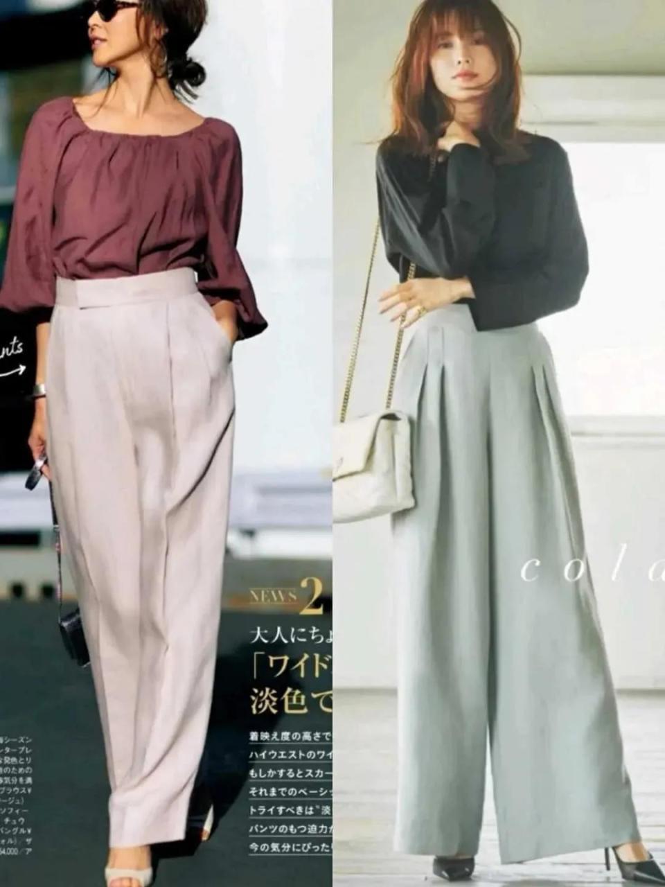 但是像下面右边的这一条卡其色的阔腿长裤就不太适合咱们普通大众,就算是高个子女生也很难驾驭的住,因为裤子太长,穿在身上之后就有点拖沓邋遢,会压身高。