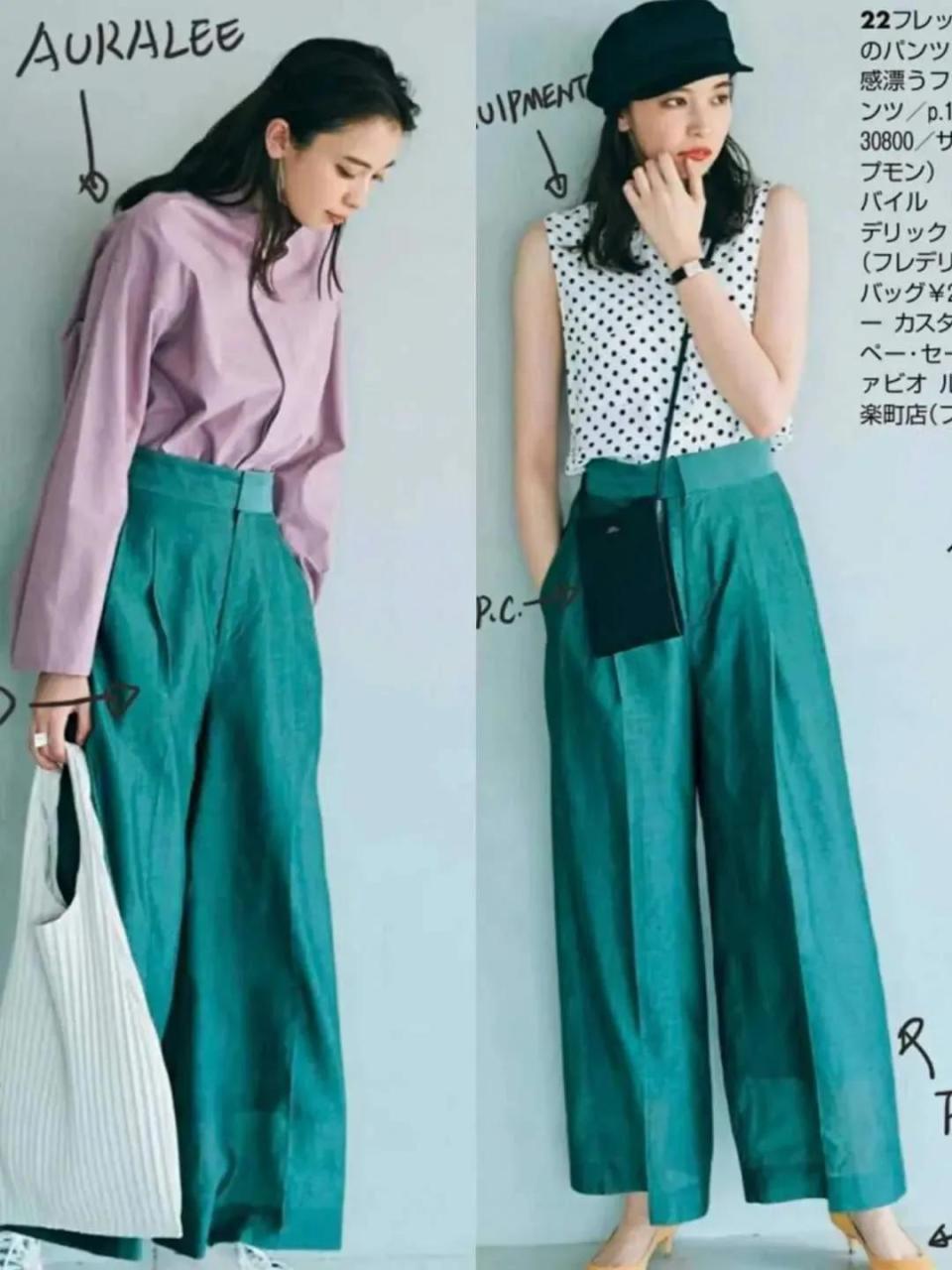 接下来我们再来说一下衣服的颜色选择,颜色也是能决定整体的气质,例如下面这种绿色的阔腿裤,我们看模特穿搭拍出来的照片确实很时尚,但是真的放在现实生活中就达不到预想的效果了,如果气质身材不佳的情况下穿在身上之后还会显得廉价。