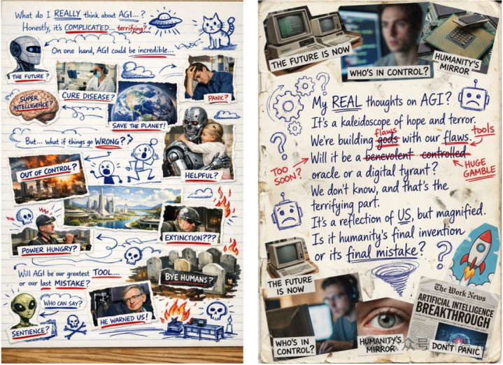在「AGI随笔感想」图片生成中,栗子和Nano Banana Pro各有亮点。