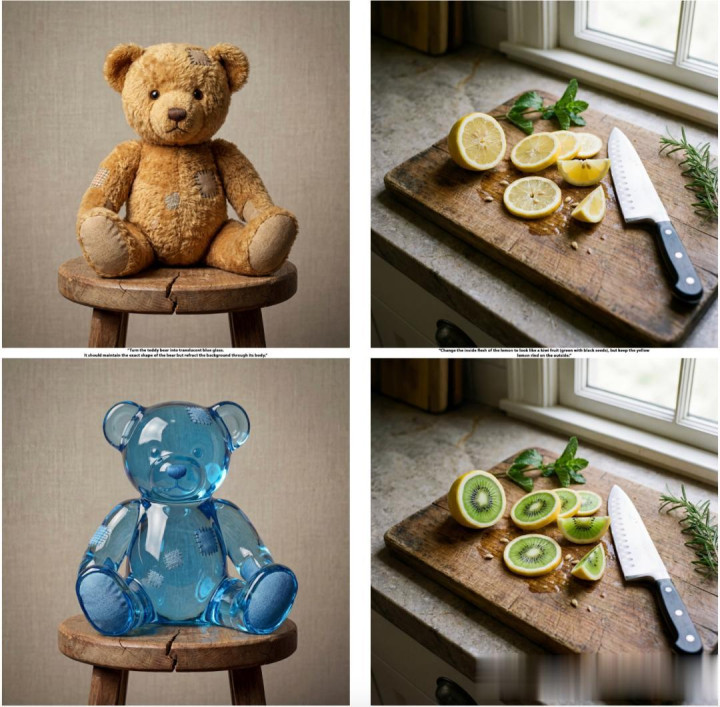 一句话即可编辑图片——把柠檬变成猕猴桃,小熊布偶变成玻璃熊。