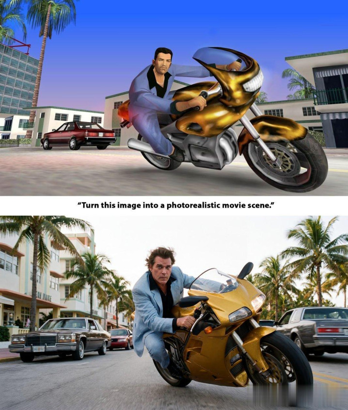 它可以把GTA游戏画面,直接转化成真实的电影质感的图片。